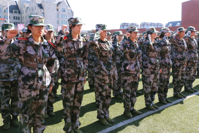 最后,大會舉行軍訓(xùn)誓師儀式。訓(xùn)練團七營營長蘇廣宇領(lǐng)誓,全體參訓(xùn)學(xué)生舉起右拳,在莊嚴(yán)的氛圍中進行宣誓。“請黨放心,強國有我”誓言鏗鏘有力,迷彩青春與強國使命在此刻交織。