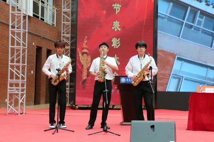 會上,師生同臺表演了配樂詩朗誦《燈塔》、薩克斯合奏《世界贈予我》。