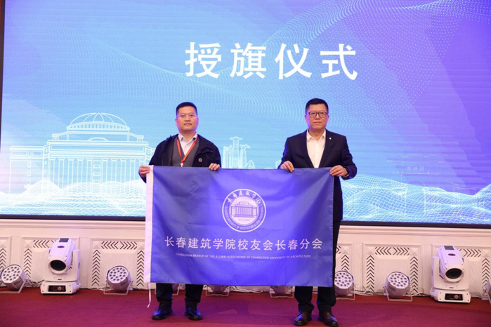 在全場矚目下,孫雷為長春分會授予牌匾與旗幟。新任會長陸其鎂上臺接牌,秘書長薄磊接旗,牌匾代表分會的組織身份,旗幟承載著校友間的凝聚力,此舉也意味著學校在長春地區的校友工作邁入全新階段。
