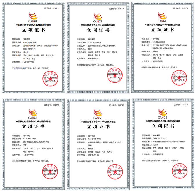 為助力分類管理改革平穩推進,促進特色發展與人才培養質量提升,中國民辦教育協會組織了2025年度規劃課題的申報工作。根據《中國民辦教育協會課題管理辦法(2025年修訂)》和《關于申報中國民辦教育協會2025年度規劃課題的通知》規定,經協會組織專家評審、推薦立項,最終我校有6項課題立項“2025年度中國民辦教育協會規劃課題(青年課題)”。