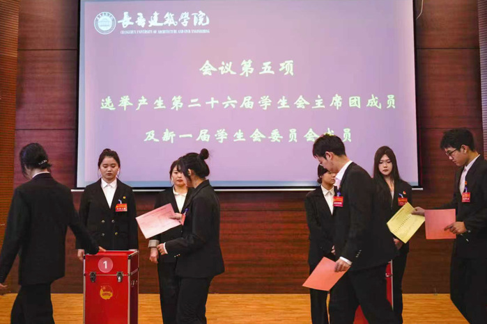 大會審議并通過《長春建筑學院第二十五屆學生會組織工作報告》《長春建筑學院第六次學生代表大會提案工作報告》《長春建筑學院學生會組織主席團及學生會委員會選舉辦法》,以無記名投票方式選舉產生長春建筑學院第二十六屆學生會主席團和學生會委員會委員。