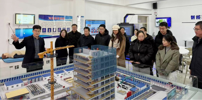 隨后,調研團隊實地參觀了智能建造體驗館,模型還原了工地場景,包括樓房結構、塔吊、道路和配套設施,細節比較豐富,可用來講解建筑數字化、智能施工等技術與知識。